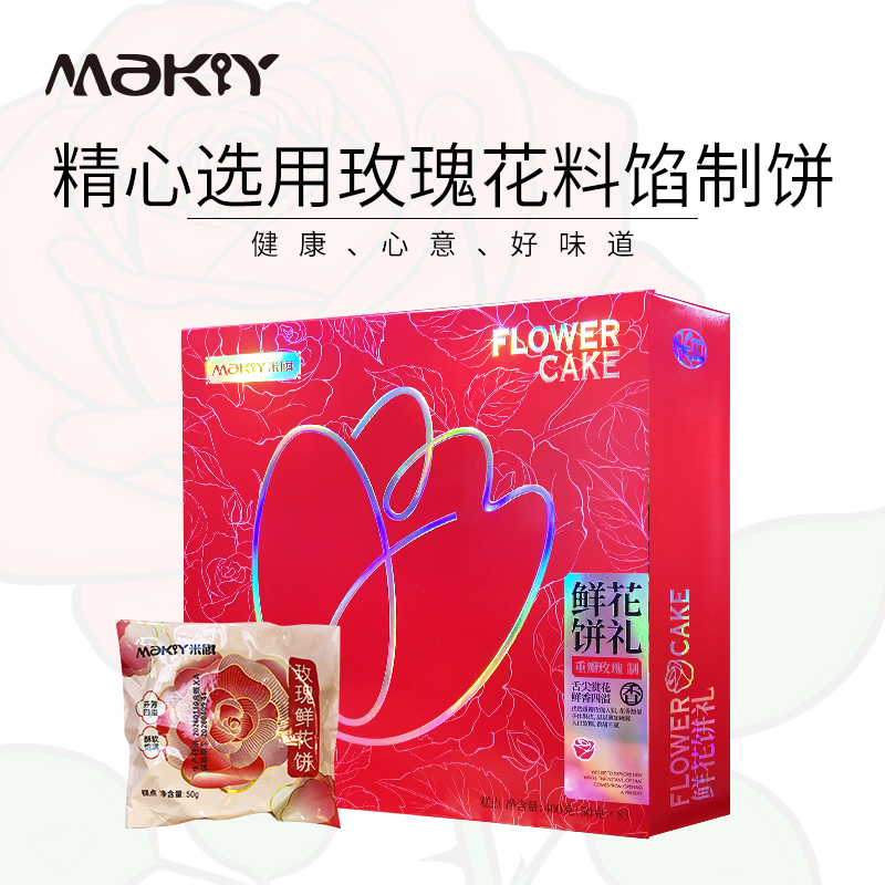 精心选用玫瑰花料馅制饼(添加15%重瓣红玫瑰花),入口芬芳自然,齿颊留香。