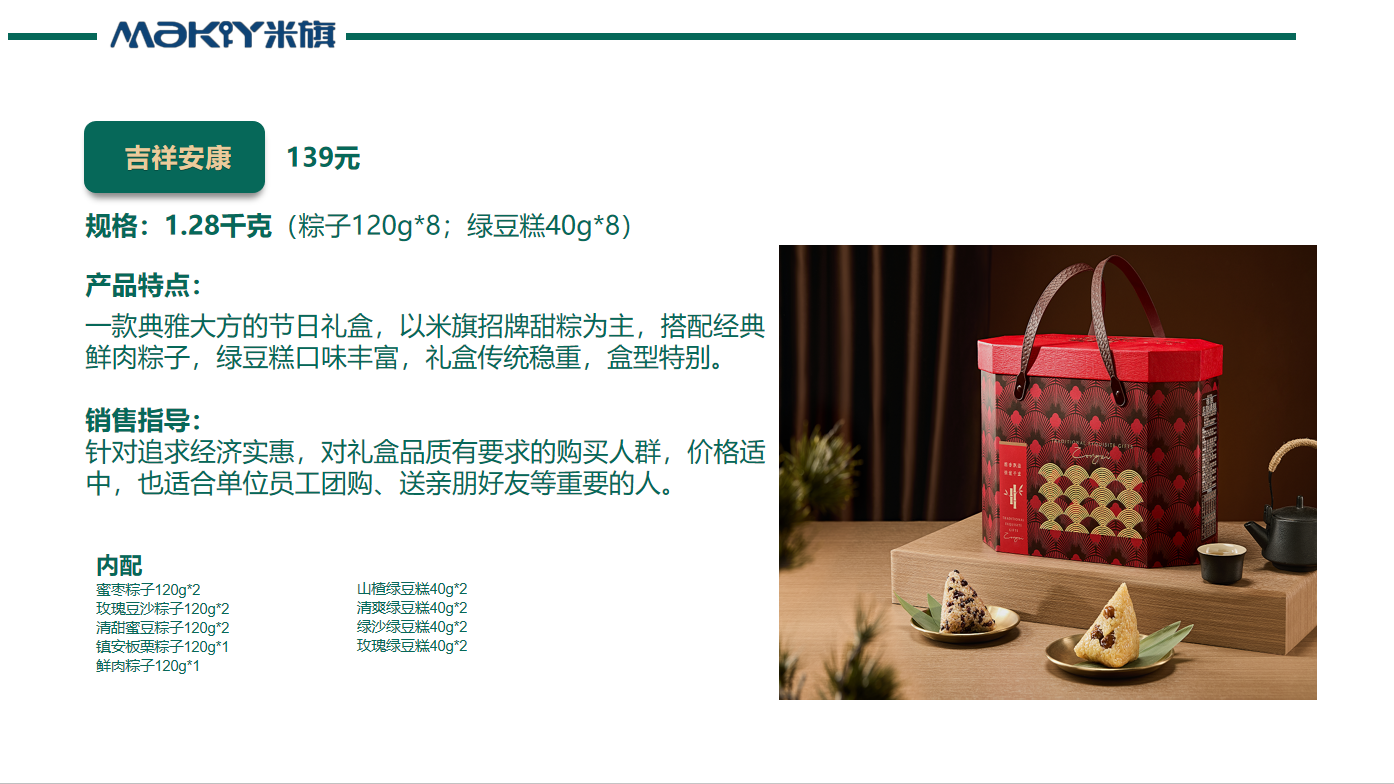 一款典雅大方的节日礼盒,以米旗招牌甜粽为主,搭配经典鲜肉粽子,绿豆糕口味丰富,礼盒传统稳重,盒型特别。